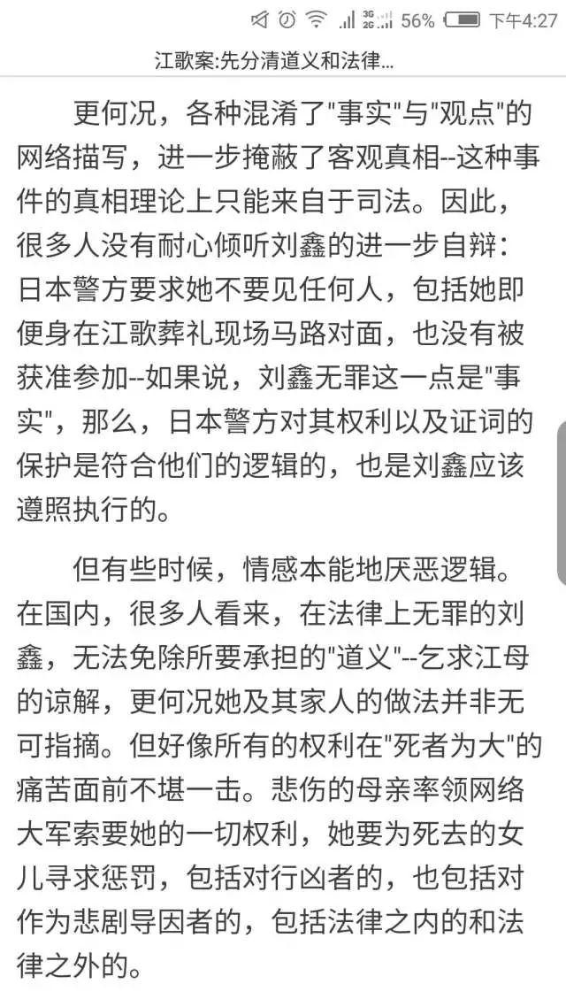 说刘鑫是卖的还是轻的。大家还要“鼎力助”去“帮助江歌”,2017年5月21日,江歌母亲在网上曝光了刘鑫全家人的家庭住址、工作单位、车牌号等信息。加上网友强大的人肉搜索,更是连照片都没放过。