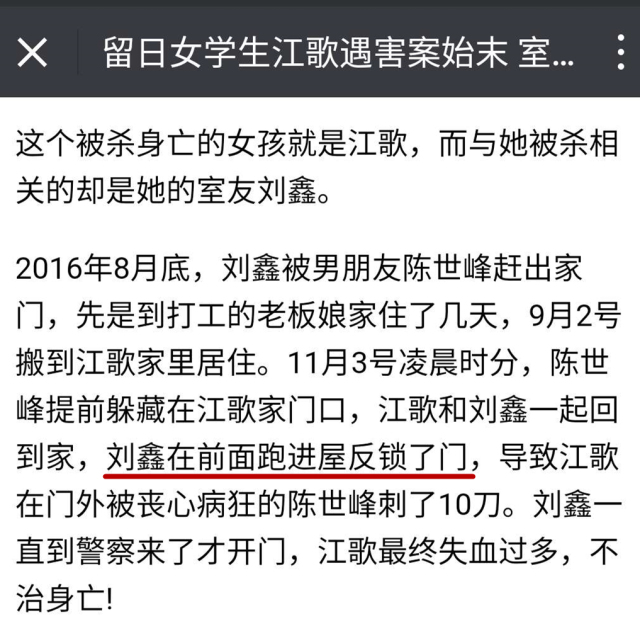 2016年8月底,刘鑫被男朋友陈世峰赶出家门,先是到打工的老板娘家住了几天,9月2号搬到江歌家里居住。11月3号凌晨时分,陈世峰提前躲藏在江歌家门口,江歌和刘鑫一起回到家,刘鑫在前面跑进屋,江歌在门外被丧心病狂的陈世峰刺了10刀。刘鑫一直到警察来了才开门,江歌最终失血过多,不治身亡!