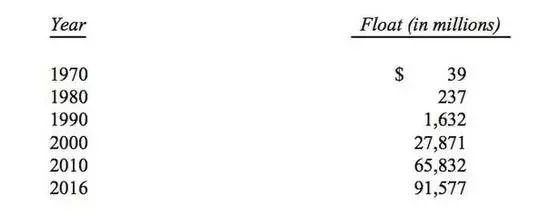 我们被财险业务吸引的原因之一是其金融特征 : 财险公司提前收到保险费 , 之后再支付理赔金 。 在极端情况下 , 例如理赔产生于接触石棉 , 款项支付可延续好几十年 。 这种现在收以后付的模式使得财险公司持有大量流动资金 。 与此同时 , 保险公司能出于自己的利益进行投资 。 虽然个人保单和索赔变化不定 , 但保险公司持有的流动资金往往较保险费保持相对稳定 。 其结果是 , 随着企业发展 , 流动资金也增长 。 至于如何发展 , 如下图所示 :