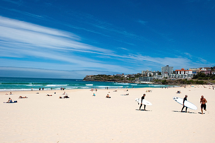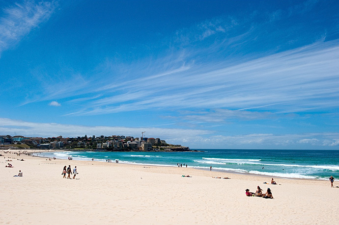 悉尼拥有70多个海滩,从背靠丛林和国家公园的隐蔽海湾,到世界闻名的沙滩地带,不论哪里海水都是清澈碧蓝,白沙细软干净的。在南海滩和北海滩中最受当地人和游客欢迎的就是邦迪海滩(Bondi Beach),Bondi在澳大利亚原居民的语言中,是“激碎在岩石上的浪花”,顾名思义,蓝色的大海与洁白的浪花交相辉映,美丽绝伦,这里无论在夏季或冬季,都是悉尼的精华所在。眼下中国已经是冬季,而南半球的悉尼刚刚开始入夏,每逢阳光明媚的日子,许多悉尼人就会聚集在邦迪海滩上享受阳光的沐浴。海滩夏季的生活非常舒适,多数的游人或趴在海滩上晒太阳或冲浪。如果你是狂热的冲浪爱好者、酷爱日光浴,或者就是喜欢大海,来到邦迪,你会忍不住跃入水中、呼吸略带咸味的空气,或闲适地躺在沙滩上……