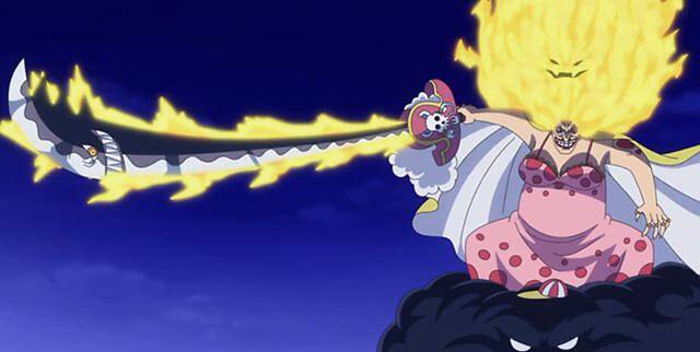 甚平的奥义攻击,虽然击飞了大妈,却没有什么伤害。骑在宙斯身上的大妈,将拿破仑伸长为更巨大的剑,试图用巨剑将桑尼号一分为二。娜美再次使用美食云吸引宙斯,没想到宙斯不上当反而发出电击。布鲁克及时出现,利用不怕电的骨头身体挡在了娜美前。之后,布鲁克使用“魂之燕尾斩”,将宙斯一分为二。