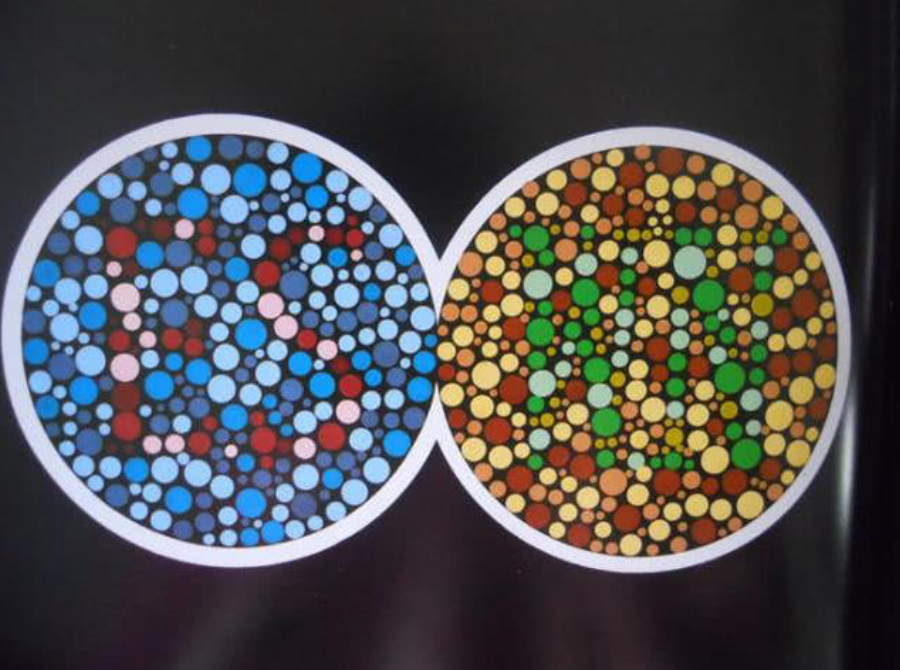 图2:在驾考的时候除了严格的红色测试,绿色测试也必不可少。例如,在上面的图片中,检测地图由两个圆圈组成,分别是红色和绿色的识别测试,所以如果你看不到左边的字母:es,右边的字母:wn,那你的眼力不够好。如果你看得清,祝贺你,你应对驾考没有什么问题。