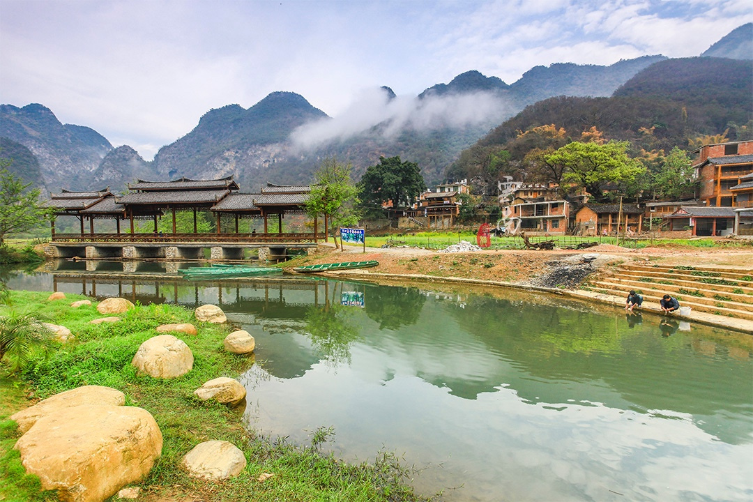 最后出得洞来,眼前豁然开朗,一个充满了少数民族风情的小村出现在面前。重山俊秀,云雾缭绕。宽阔的田野绿油油的,生机盎然。远处的风雨桥横跨在村头,背后不知谁家在做饭,袅袅青烟升腾。