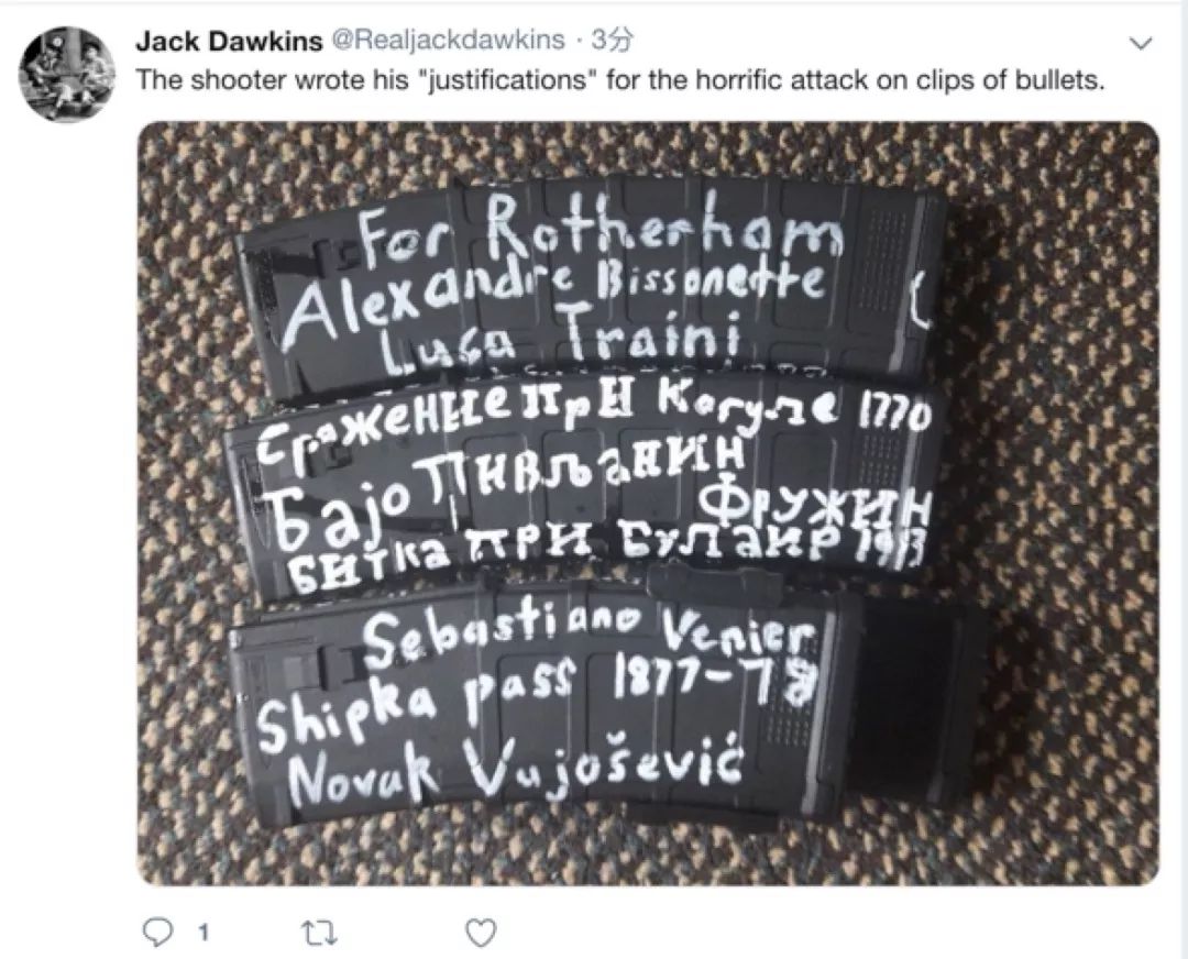 就在新西兰315恐袭案中,抢手布伦顿杀人的弹夹上写有“为了Rotherham,Alexandre Bissonnette……”