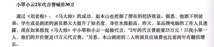 《乡村爱情》的热播,不仅带来了明面上的收益,更是放大了赵家班的深层价值。当初为了做大二人转生意,赵本山特地搭建了辽宁民间艺术团、和辽宁大学合作成立了本山艺术学院,亲自培养了一大批艺人。在《马大帅》里,不少他的徒弟已经有了露脸的机会,很多参演者的出场费都因此翻上了一番,并且陆续能接到一些代言邀约。《乡村爱情》这部群像作品的播出,则给了他的徒弟们更多施展空间。