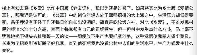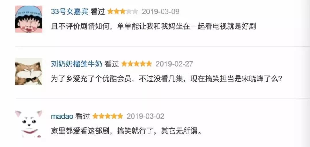 而也正是在这种变化下,“《乡村爱情》为何受欢迎”这样一个问题的答案,突然变得模糊起来。豆瓣上,最近几季的词条下其实也不乏对于其内容逐渐空洞、主线不够明晰的批评,但很多观众仍然给出了不错的评分,并表示:“搞笑就行了,其它无所谓。”