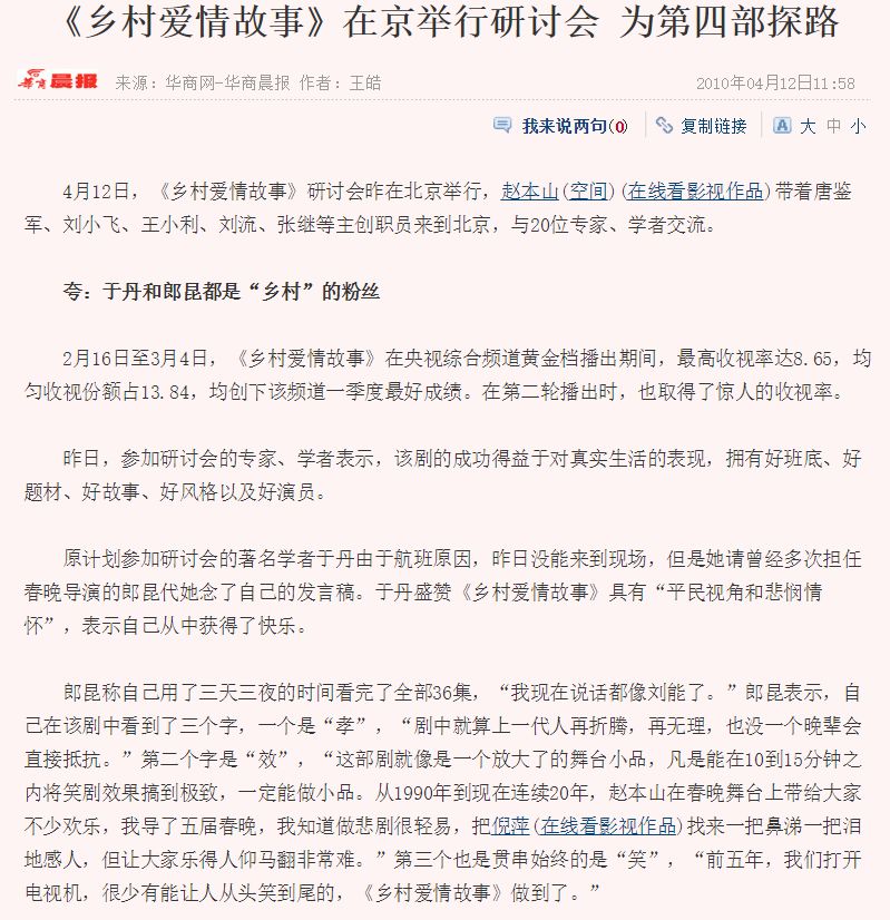最终,在实际上并不那么祥和的氛围里,研讨会画上了句号。不过对于赵本山和《乡村爱情》的“讨伐”,才刚刚开始。