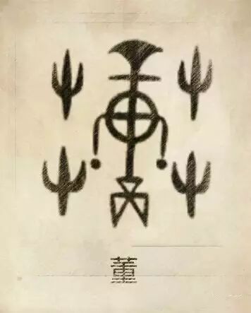 董姓图腾,董姓是炎帝第五世祝融(烛龙)八姓之一。董姓是风姓分支,祖先名飂叔安,其子继承太昊氏(风姓)驯养扬子鳄(古称龙)的本领,服侍于舜,赐董姓,为侯伯,因而可以在居邑设立天文仪器“重”,有了祭天权。董由天文仪“重”(中)和四游表()构成。“重”为主表居中,四隅方置四游表。