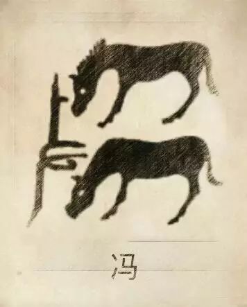冯姓图腾,冯姓是牧马民族的族称,由两个马组成冯氏图腾,一匹马为雄马,一匹马为雌马。图腾左边的图案代表着牧马人手拿着鞭子,牡牝二马繁衍为马群,代表牧马民族子孙的繁衍昌盛,始祖冯翀(河伯),地为冯邑,以地为生
