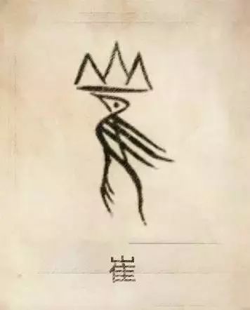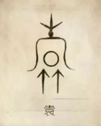 徐姓图腾,徐是淮夷一支的族称,由“余”和“太阳鸟”组成。(左边是玄鸟向日,暗合徐氏始祖由鸟所生的传说。)“余”本是“俞”,类似箭矢的尖锋,它装在天竿华表建木的顶端,指向中天,用它来代表“天齐”(天的肚脐),也就是“中央”。这个形状在7400—7000年前的湖南黔阳高庙遗址的陶器刻符和浙江余姚河姆渡遗址的陶器和骨雕上的刻符上,都已出现为天竿俞。