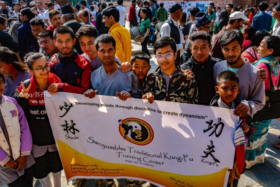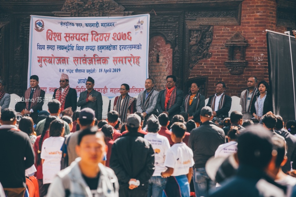 在浩荡拥挤的人群里,一个正拿着手机拍照的尼泊尔妇女,穿着一件白色T恤,背后写着:“World Heritage Day 2019”(2019世界遗产日)。“少林功夫”中的带眼镜的尼泊尔小女孩说:“今天是一个重要的日子,许多学校和学生都会来参加,这是世界遗产日,对杜巴广场,对我们而言,非常重要。”