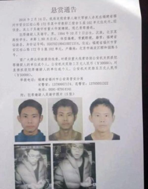 2016年3月3日,福州警方发布悬赏通告,悬赏万元缉捕吴谢宇。