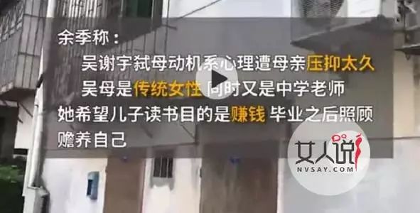 听到这句话,吴谢宇感受到了人生的无力,心中暗生杀机。他知道他父亲的人生不幸,他知道自己一直被控制,似乎死才最终解决方案,而死有两种:一种是自杀,自我毁灭;而另一种就是弑母,杀掉阻碍自己的人!