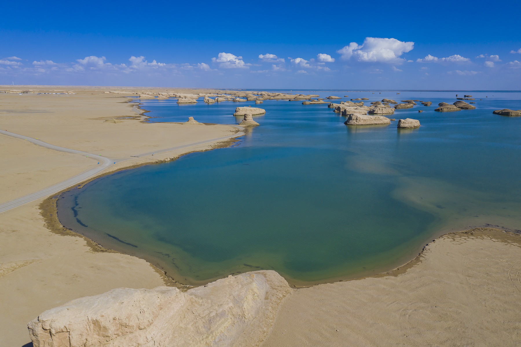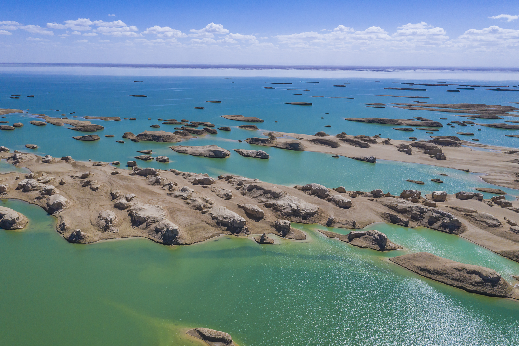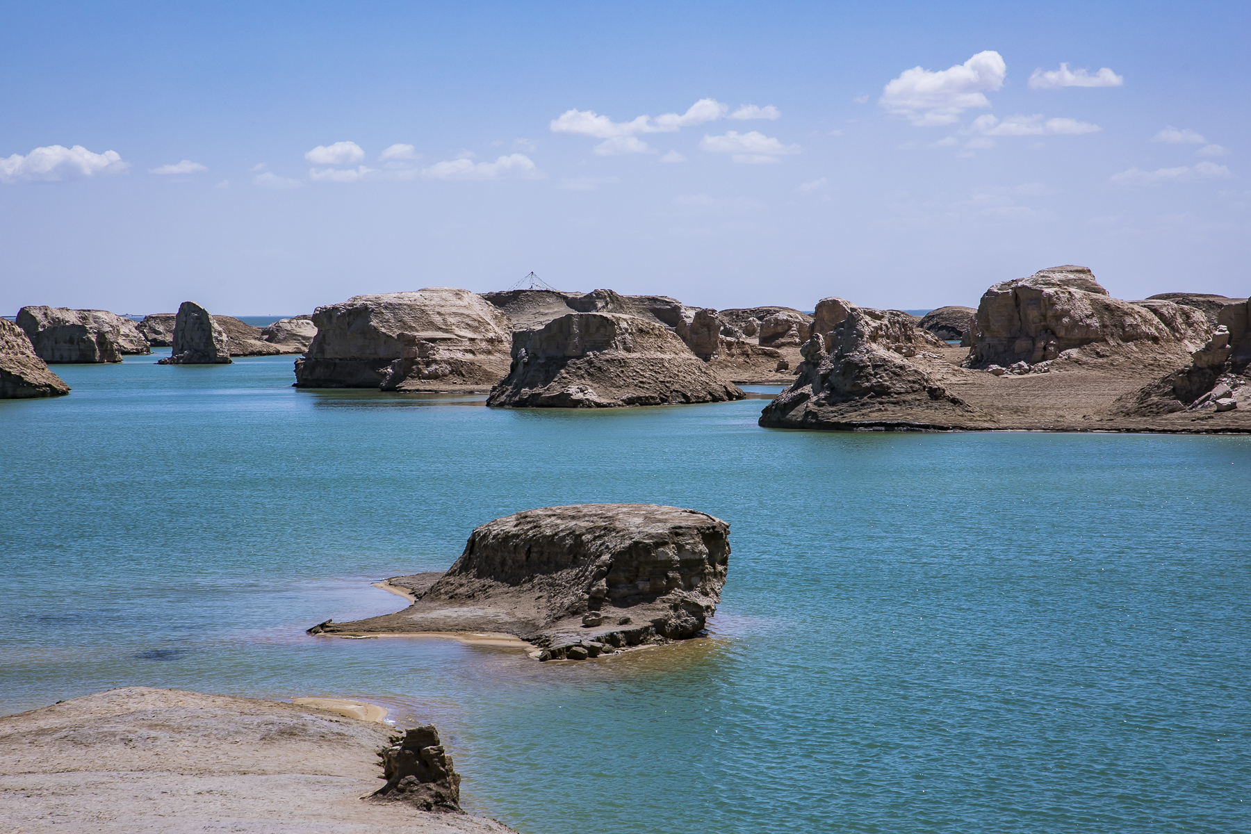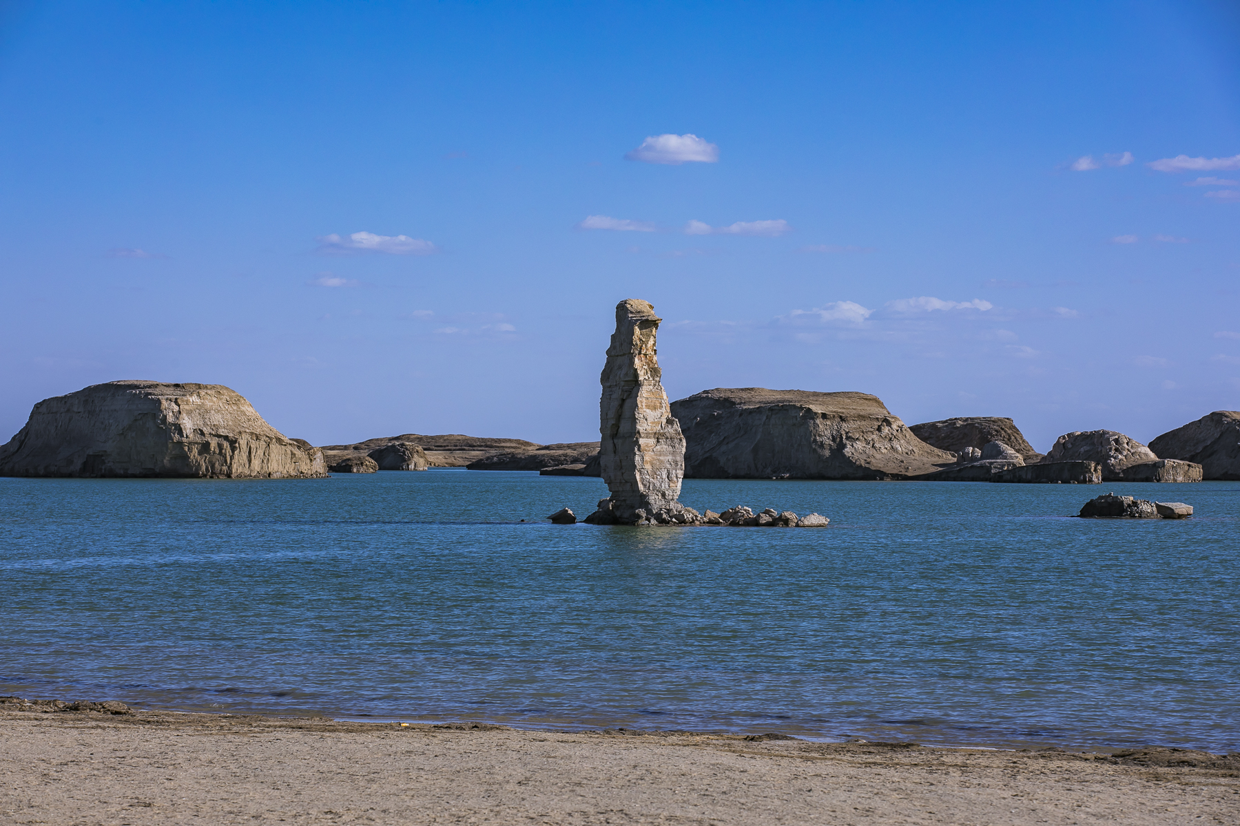 以前这里也是以旱地雅丹为主,因近年昆仑山融雪增加,致使吉乃尔湖面抬升,逐步淹没北缘的雅丹群,形成了独特的水上雅丹。首次来到这里,广阔的湖泊像一处魔幻而神秘的大海,湛蓝、宁静。极目四野,水与山丘完美的映衬,在蓝天白云下,又像是悬浮在天地间的魔幻城堡。