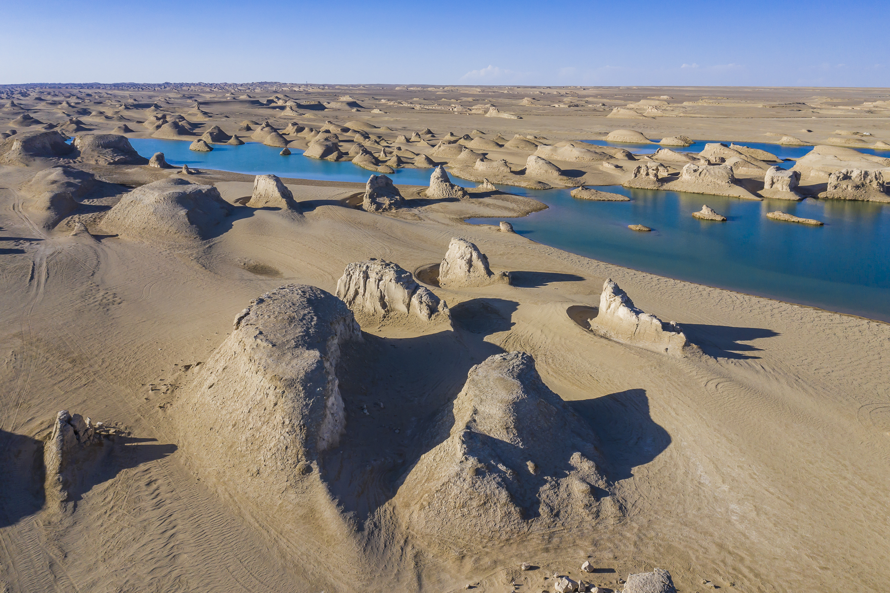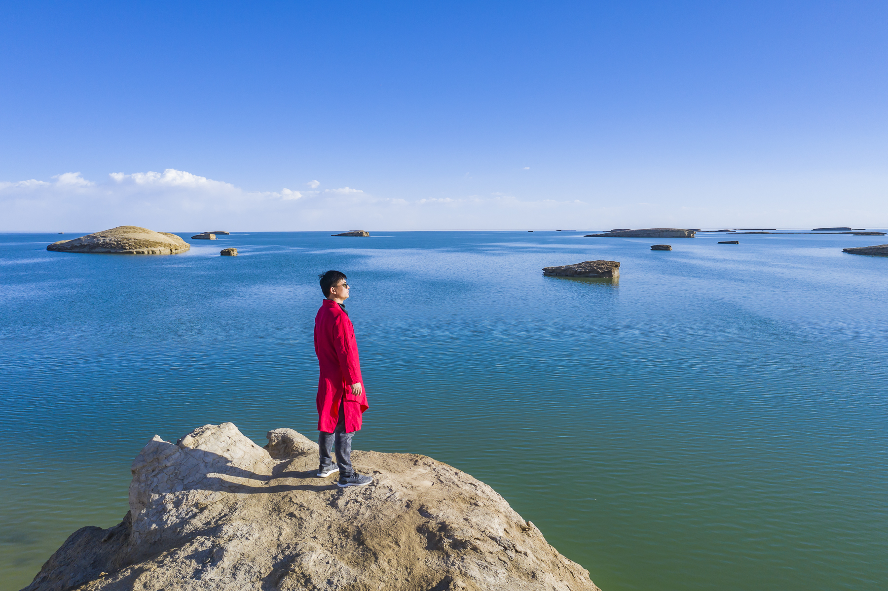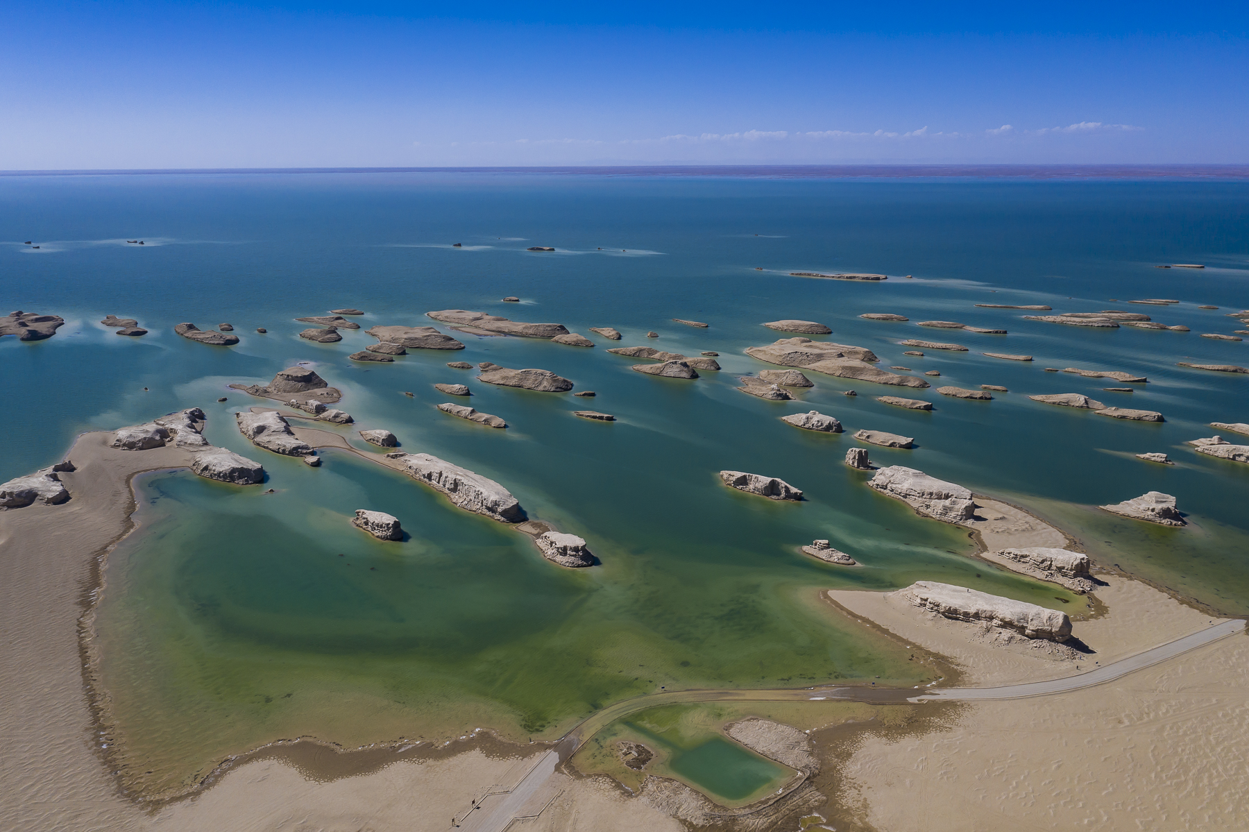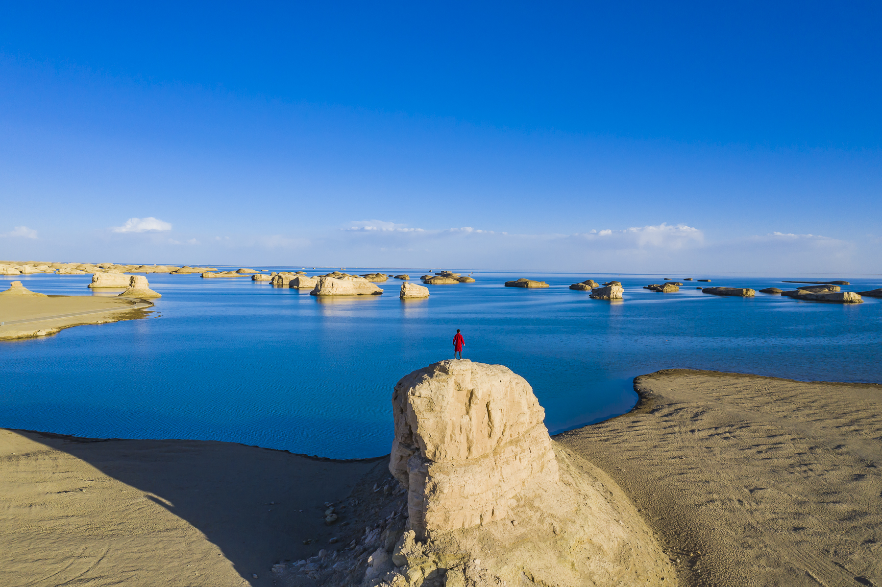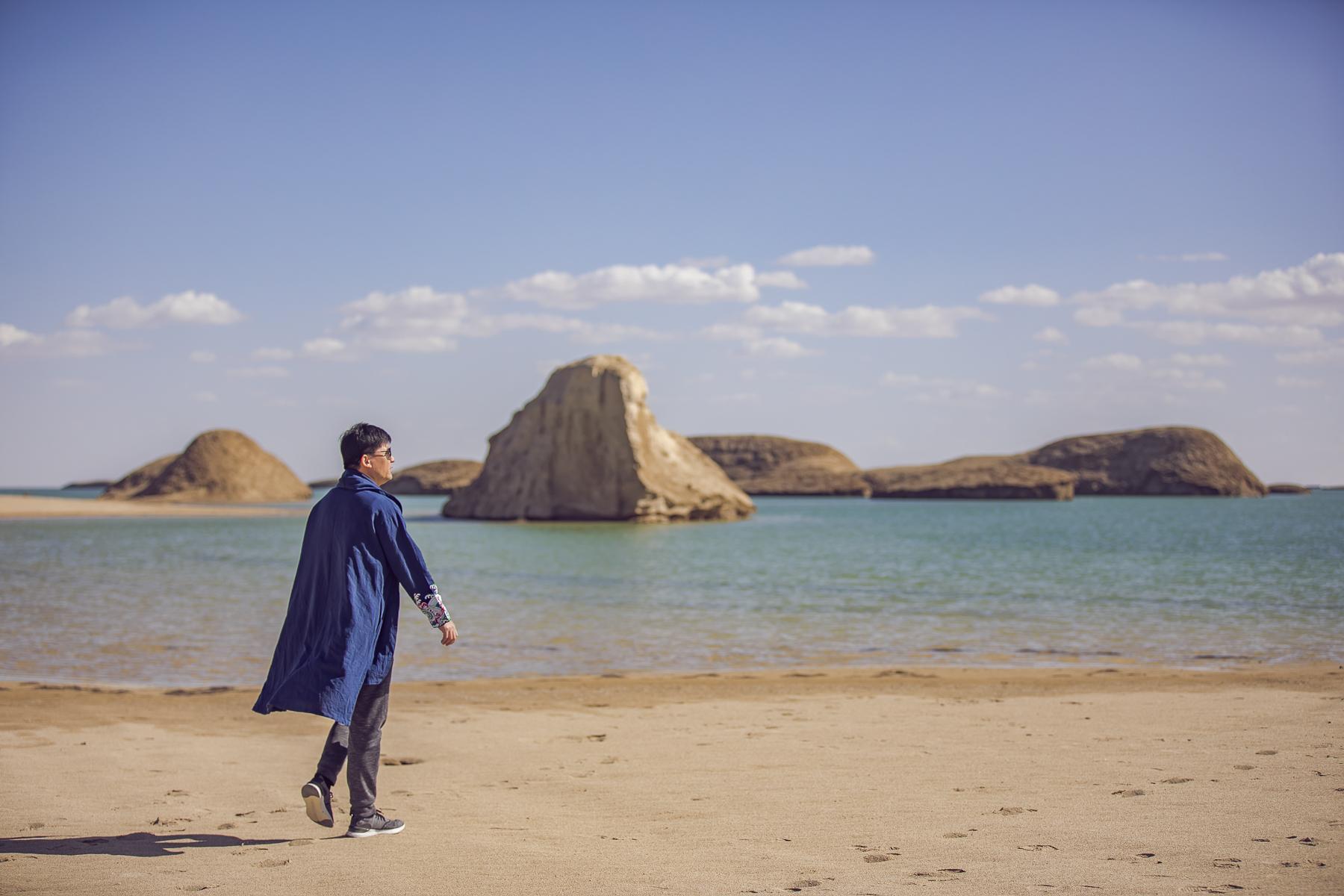 以前这里也是以旱地雅丹为主,因近年昆仑山融雪增加,致使吉乃尔湖面抬升,逐步淹没北缘的雅丹群,形成了独特的水上雅丹。首次来到这里,广阔的湖泊像一处魔幻而神秘的大海,湛蓝、宁静。极目四野,水与山丘完美的映衬,在蓝天白云下,又像是悬浮在天地间的魔幻城堡。