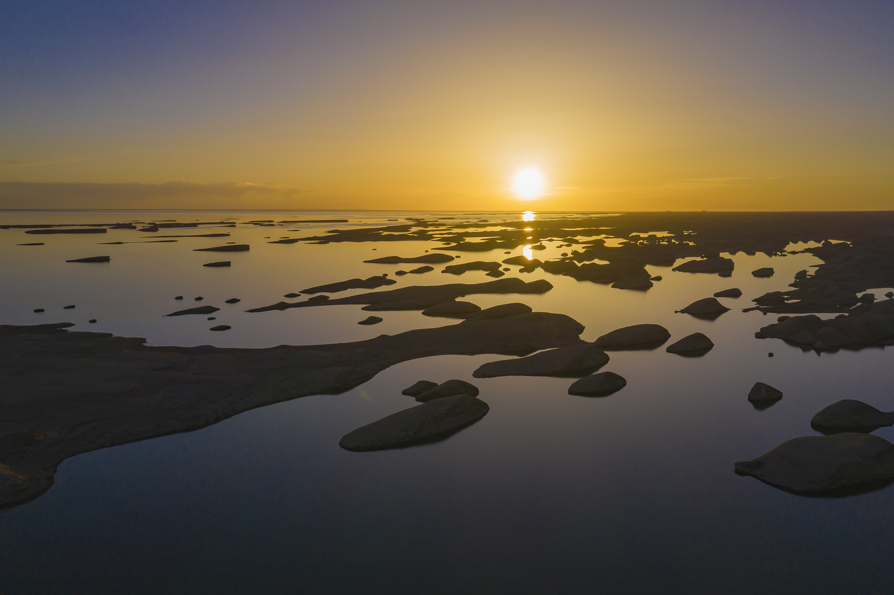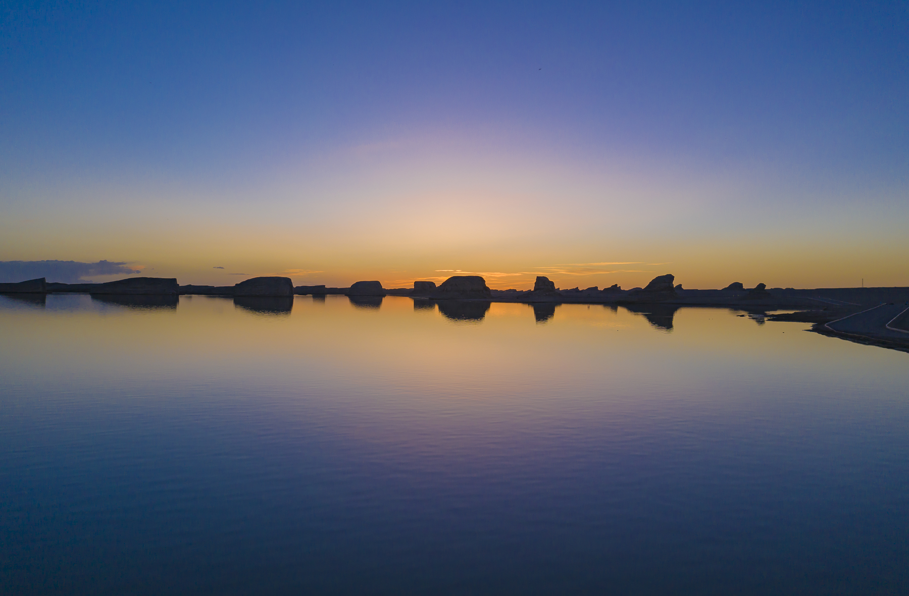 从朝霞满天到日暮垂落都如梦似幻,阳光照在水上雅丹上,颜色金黄,石柱和倒影感觉升到了半空中,像悬浮在空中的魔幻城堡。