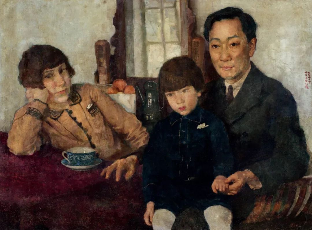 杨仲子以前在瑞士学了十年音乐,是中国现代音乐的奠基人,在画面里看到是标准的西方绅士和中国古典文人的气质一体,西装革履,正襟危坐。他的妻子则是法国贵族出身,相对来说比较随便,边喝着茶。而小儿子就有一点点抱怨的表情的。