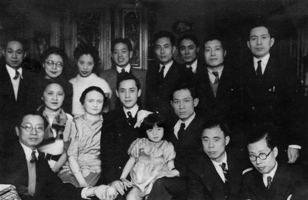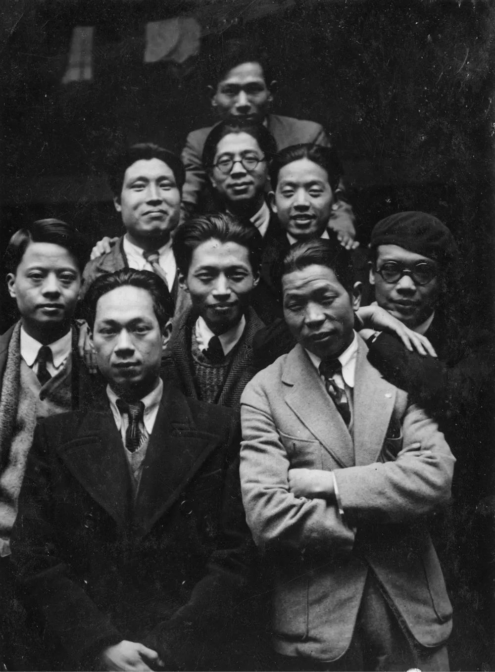1936年,中国留法艺术学会参观团在伦敦展览会门前合影,陈士文、常书鸿、陈芝秀、滑田友、张贤范在列