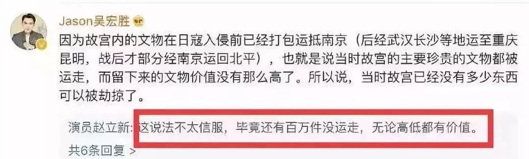 就算有网友向他科普“故宫文物南迁”的历史,他还不依不饶,“这说法不太信服,毕竟还有百万件没运走,无论高低都有价值。”