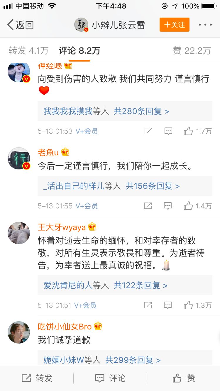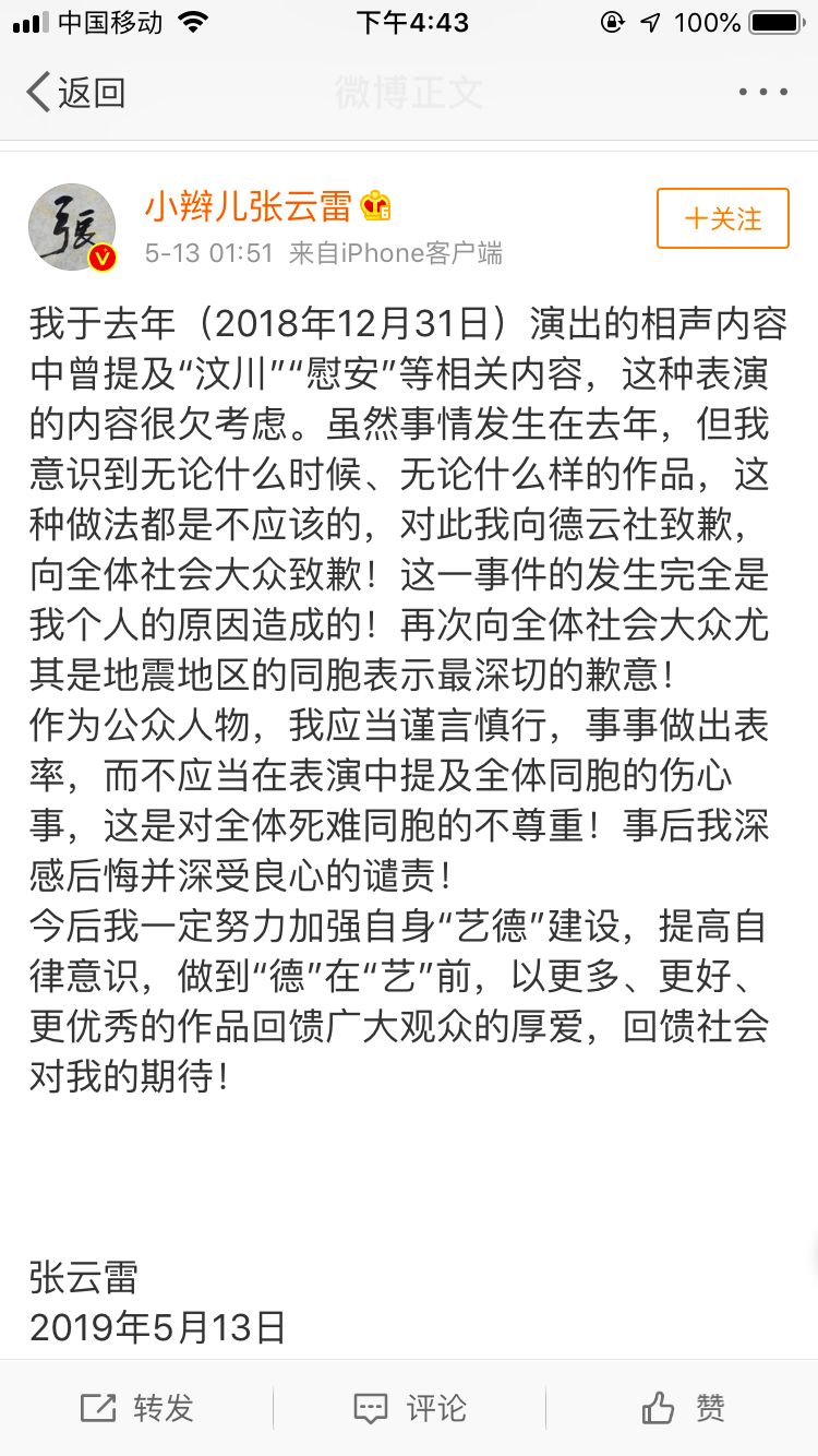 所以,当张云雷口无遮拦,调侃“地震”和“慰安”后,有些粉丝说,“他自己都是死过一次的人,怎么会不尊重生命呢?”