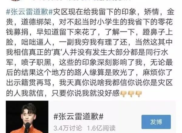 说“后悔当初捐的爱心款”,认为灾区人民“矫情、金贵、道德绑架”,还把地震亲历者批评张云雷的言论,曲解为“蹬鼻子上脸、咄咄逼人、我穷我有理。”