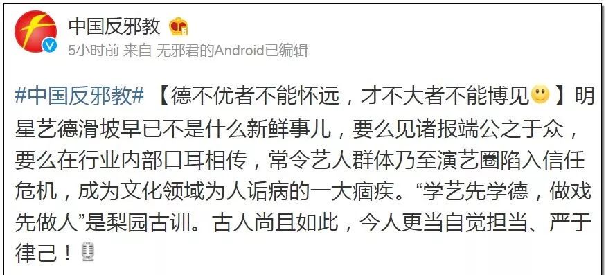 今天,紫光阁和中国反邪教都发微博批评这件事,要求艺人不能丢掉艺徳。