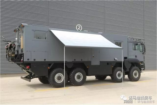 咱们就从车辆头部来介绍一下:车头保留了MAN TGS 8×8的整体元素,既然是越野房车就少不了越野的元素,驾驶室加装了整体强度铝合金防滚架,而且在车顶防滚架上还加装了LED射灯,为野外照明提供了的保障。