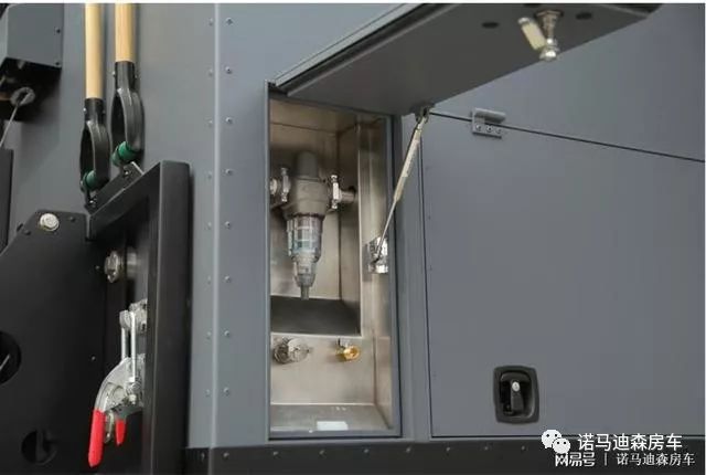 全车采用的是美国品牌全自动水泵和品牌水路系统,压力加水口,3M前置反冲洗过滤,室外用水接口,野外取水泵,保障野外用水、采水的安全、卫生。