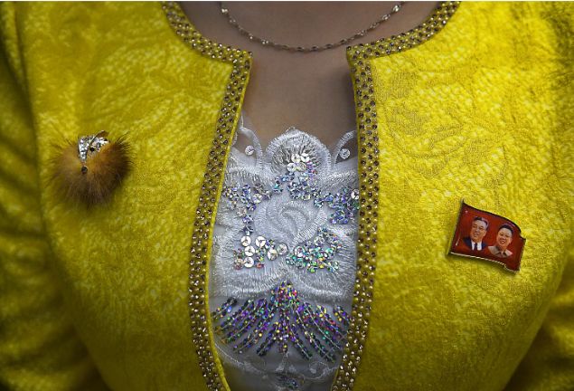朝鲜也有一些不论男女都要遵守的穿衣规范,比如每个朝鲜人胸口那根红苗正的“金氏胸针”,展示了金日成或者金正日的肖像——有时两者兼而有之。