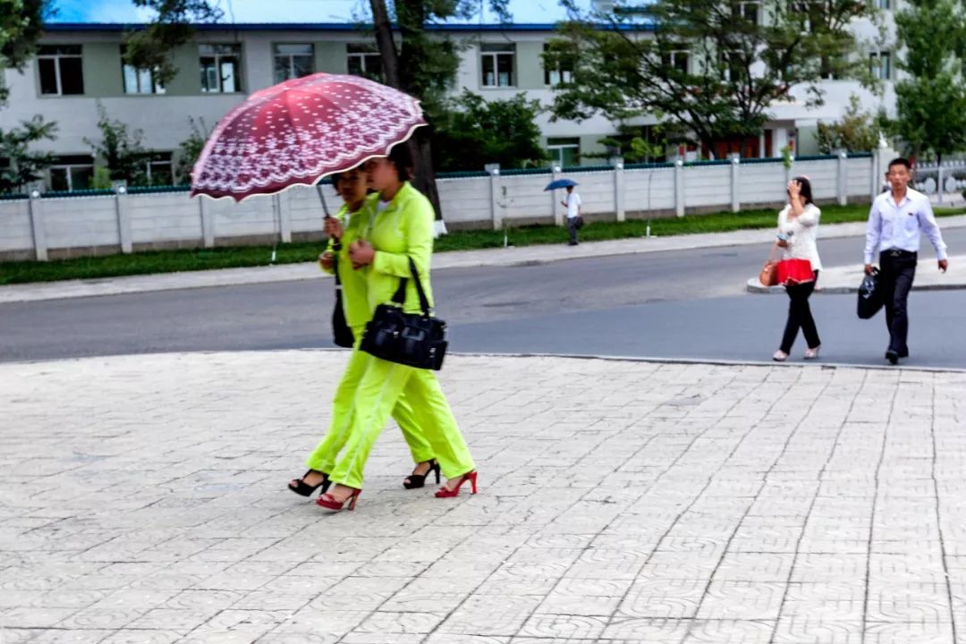 朝鲜女人们也信奉“一白遮百丑”,遮阳伞是她们的必备单品,这些伞通常是浅色的,并镶有刺绣,蕾丝和亮片。