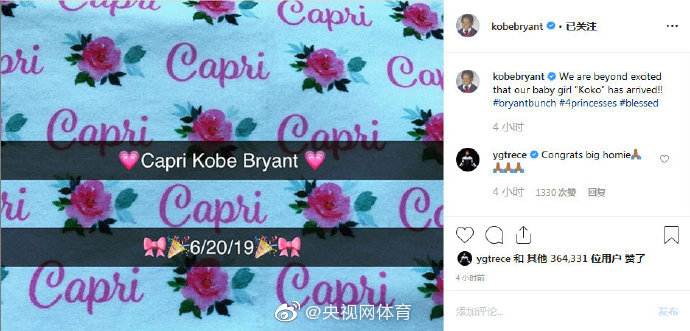据央视网体育官方微博消息科比在社交媒体上宣布瓦妮莎生下第四个女儿,名字Capri Kobe Bryant,用父亲名字做中间名,小名KOKO。