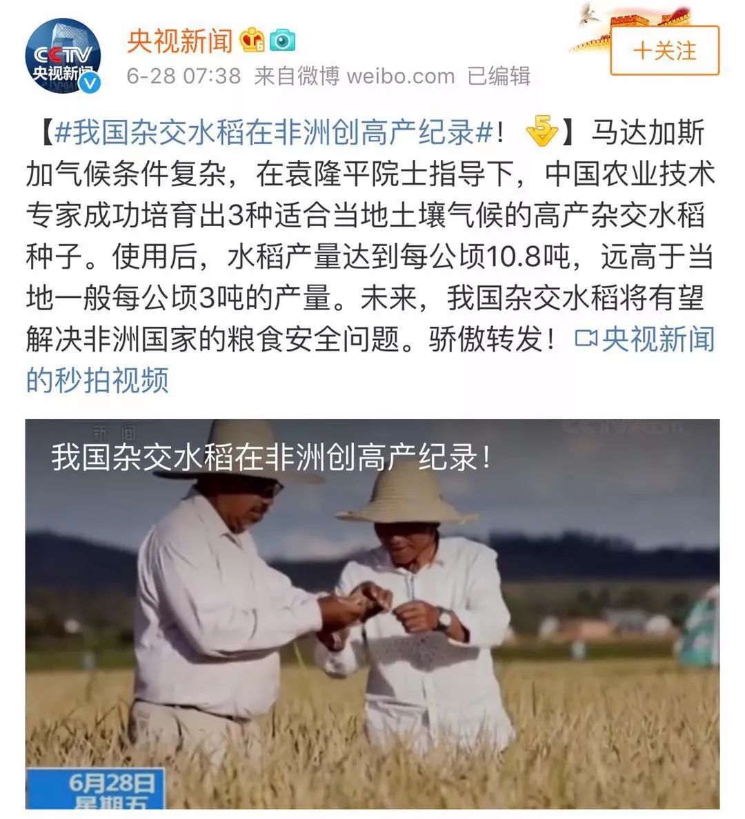 致辞中,他表示自己正致力于研究超级杂交水稻,非常愿意帮助其他发展中国家,解决粮食短缺的问题。此前,在袁隆平院士指导下,杂交水稻在非洲创高产纪录,当地原来每公顷3吨的产量,现在变成了10.8吨,非常骄傲!