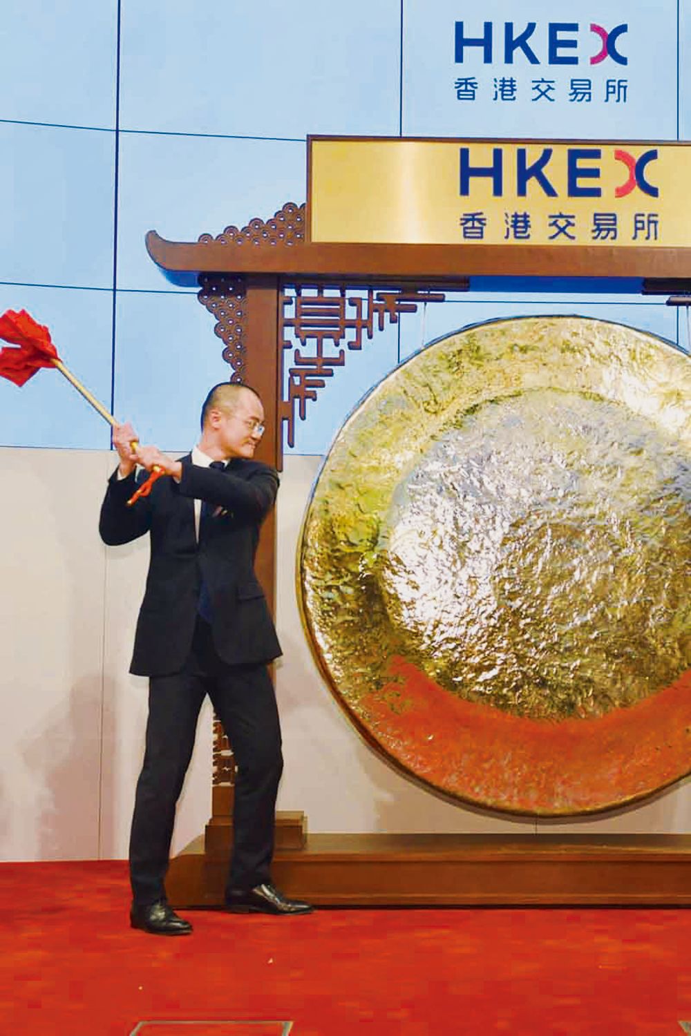图为美团点评联合创始人、董事长兼首席执行官王兴敲响开市大铜锣。
