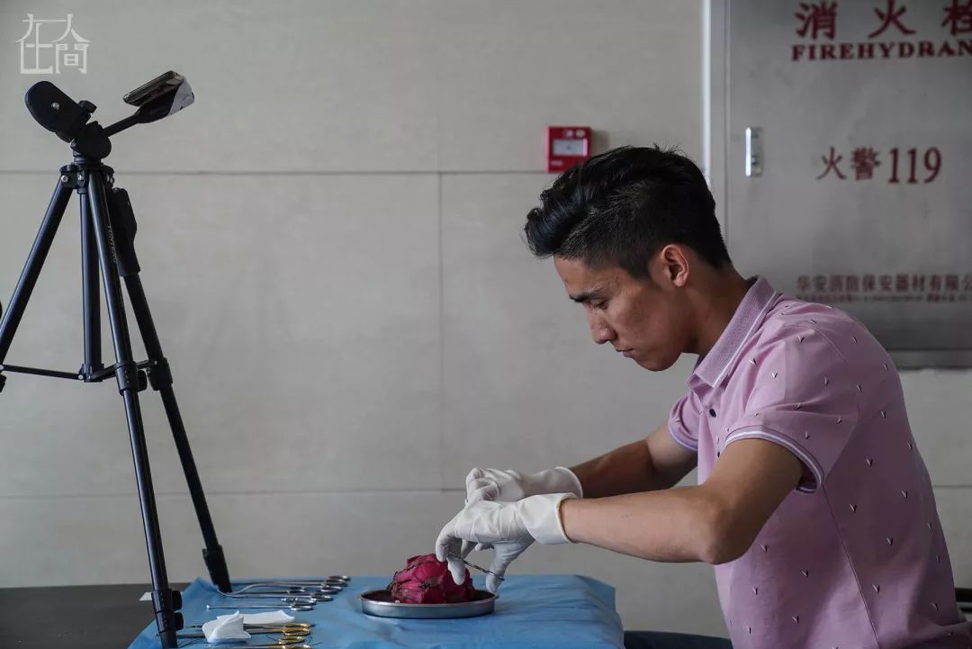 这是王野虓正在利用火龙果模拟孕妇做剖腹产手术,每一步都按照医学流程严格进行。