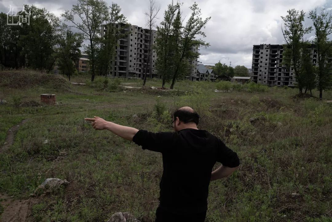 ■ 薛宝鹤指着市中心区的一处烂尾楼。他在耿军导演的《东北虎》里面担任制片工作,这里是拍摄场地之一。