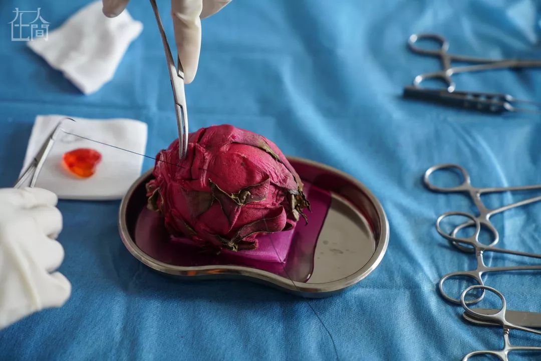 一只鲜红的火龙果,躺在手术台上,蒙上白色纱布,王野虓戴着手套,拿着医疗器械,对红龙果的“腹部”进行消毒、备皮、麻醉,一切准备工作完成后,手术刀剖开“肚皮”,分娩出“婴儿”……