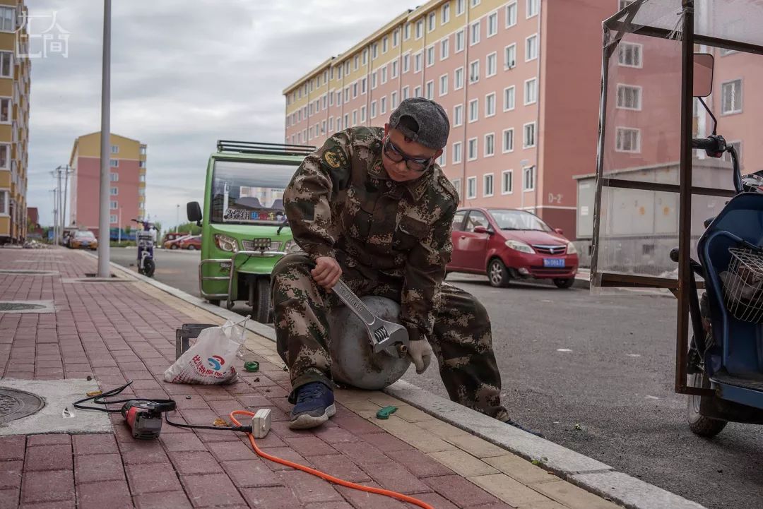 ■ 李传富在小区修理废弃的煤气罐,打算把它重新设计成一个吊炉。