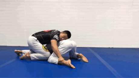上图双腿搭扣,在下位钳制住对手,破坏其中心使其不能自由移动的防守方式叫做“全封闭式防守(Close Guard)”。