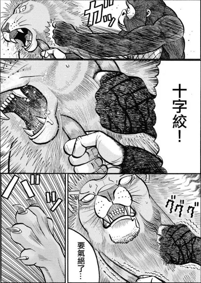 在屡次尝试攻击狮子的关节部位不成后,今贺控制住了狮子的一只前腿并拿到了一个十字绞的靶位。这招经典的绞技本是借助道服衣领做成的,在狮子没有道服的情况下,聪明的今贺利用狮子颈部的鬃毛代替道服来完成这一技术。在这里也不得不为漫画作者天马行空的想象力叫绝。