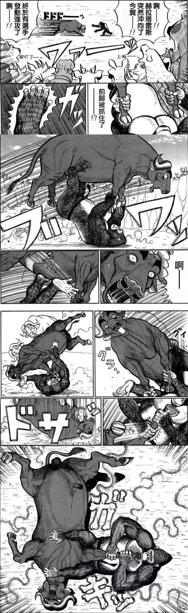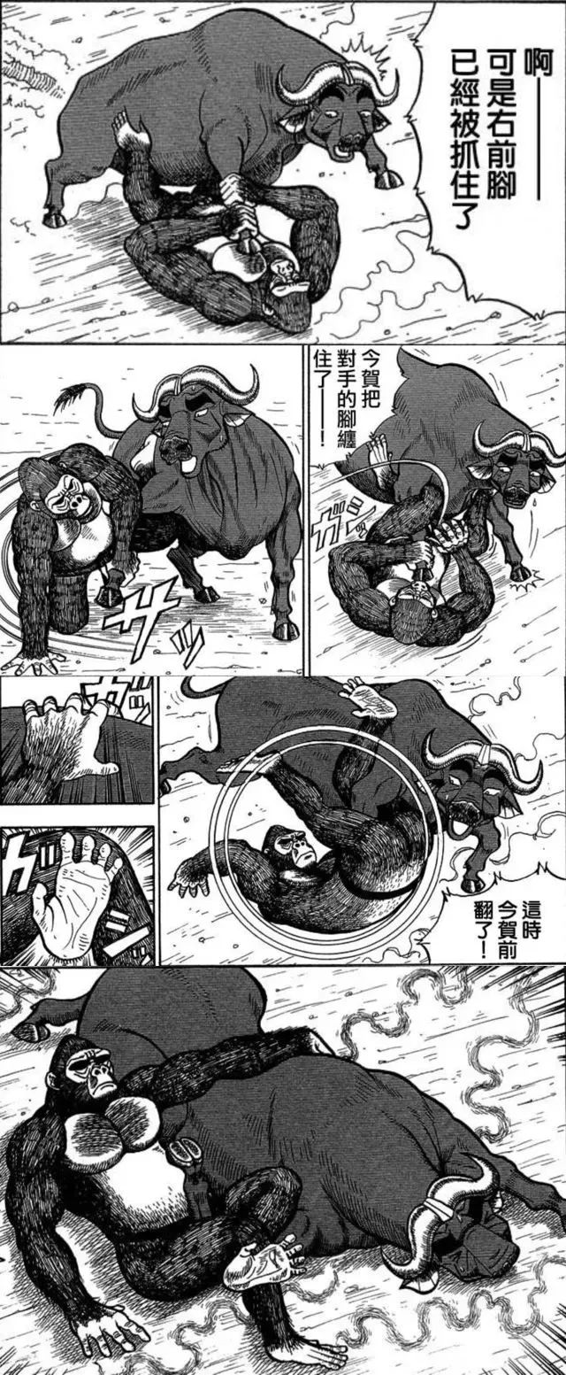 在第29话中,在面对速度力量都在自己之上的非洲水牛,今贺借助了水牛向前冲撞的力,双手控制住水牛的前腿,并用双腿蹬住水牛的胯部,在水牛悬空的一瞬间使其身体旋转,完成了一招华丽炫酷的直升机十字固。