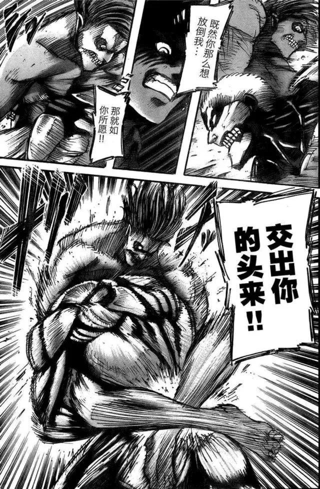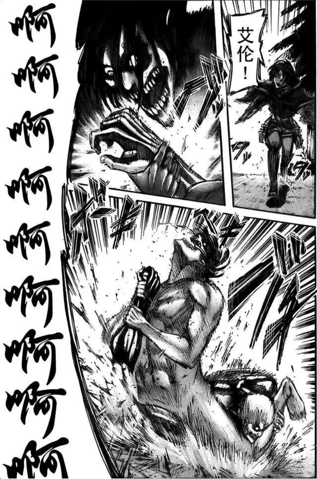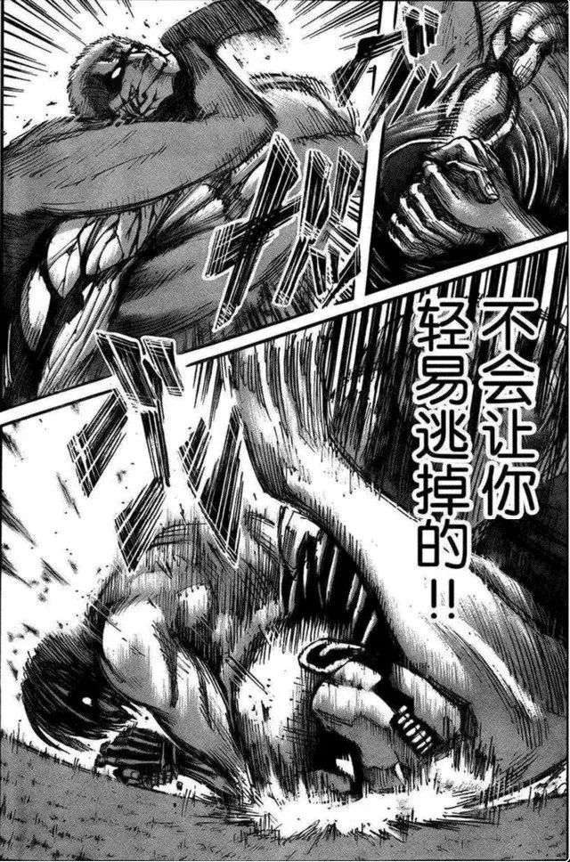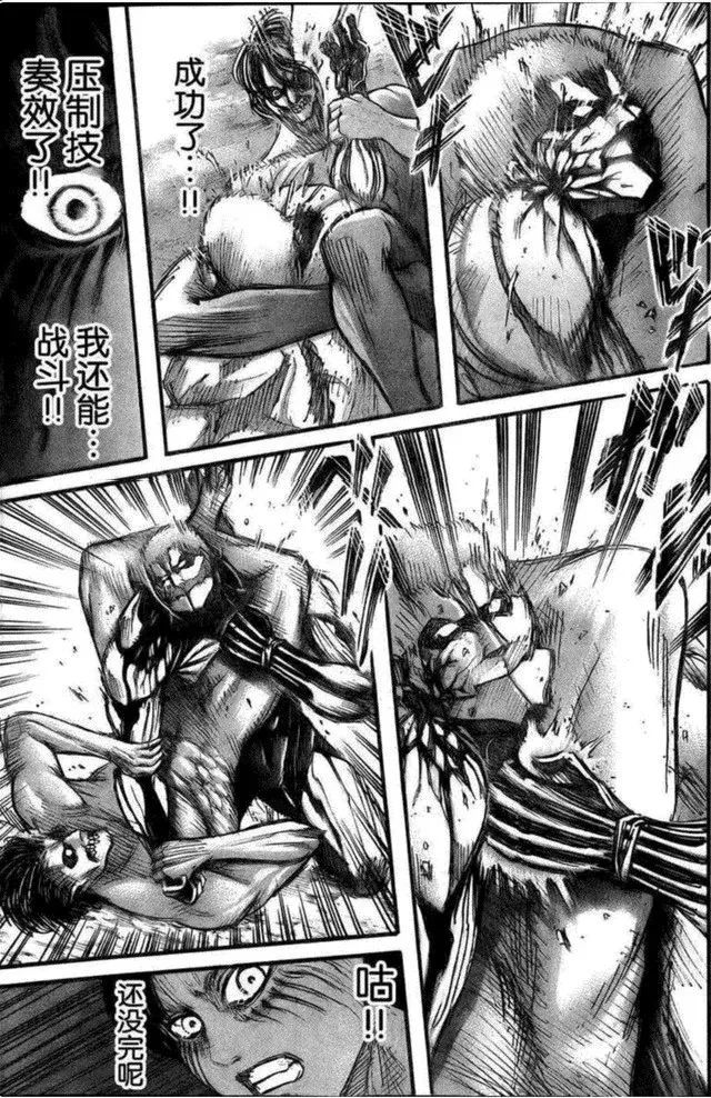 但是由于铠之巨人力量奇大,并没有轻易被降服,他开始昂首挺胸保持重心并用另一只手帮忙,试图强行破坏掉艾伦双腿搭好的“三角”。