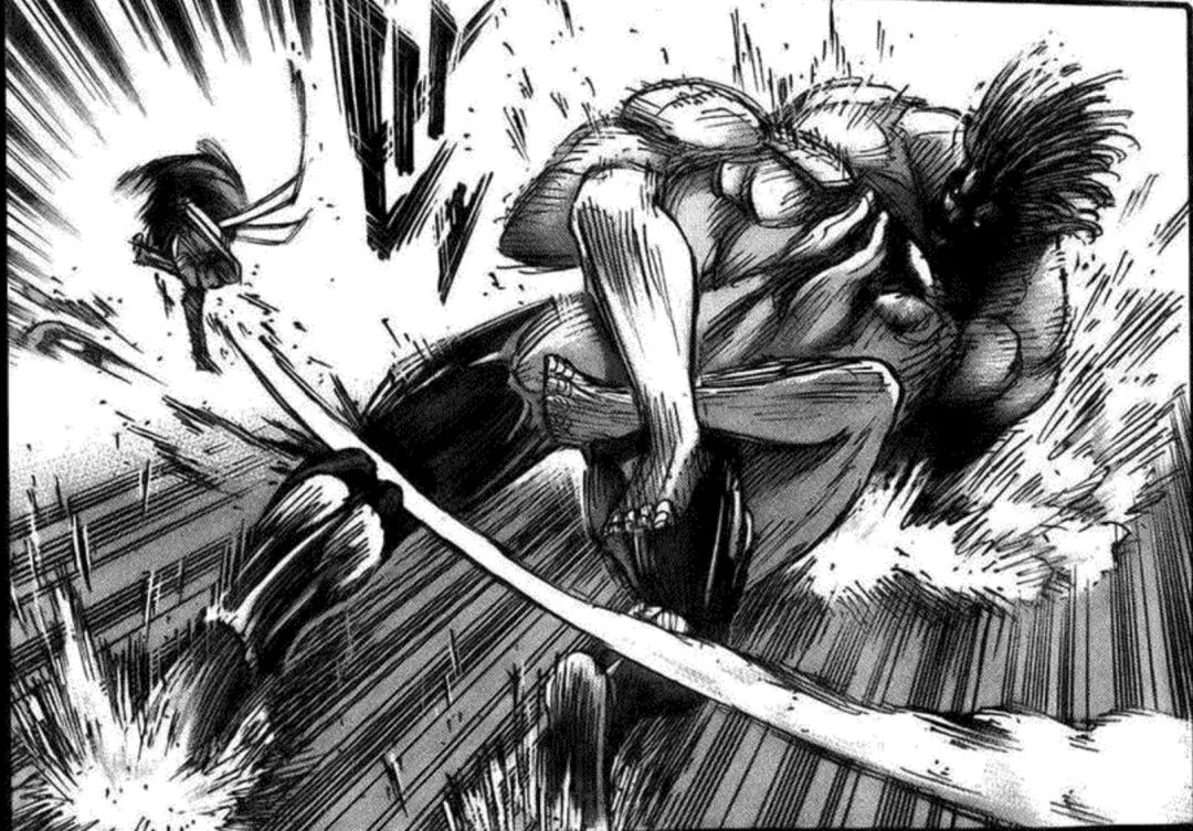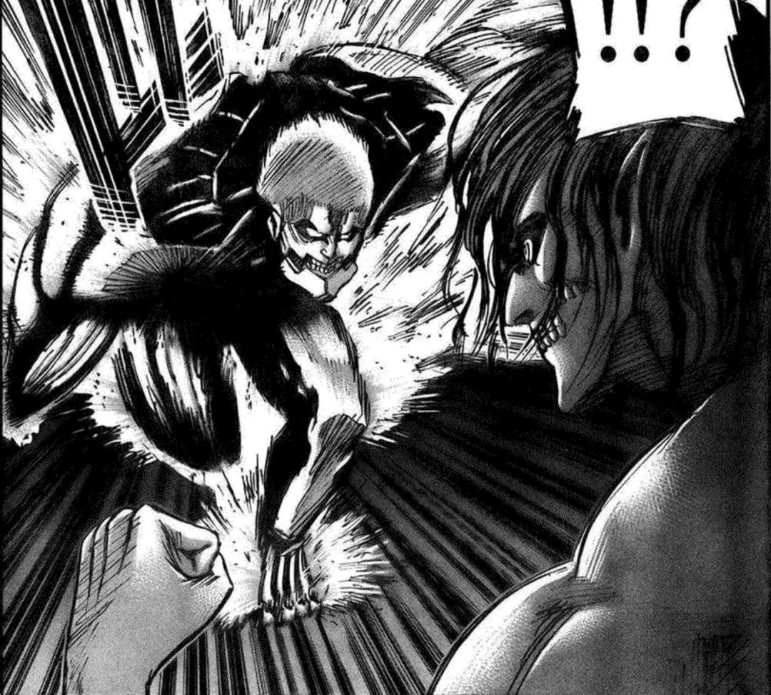 铠之巨人在一只手臂被艾伦掰断后气急败坏,拼尽全力冲向艾伦想尽快结束战斗,怎料艾伦并没有选择与其抗力,而是顺势进入下位并在倒地的瞬间用胳膊环绕过铠之巨人的脖子,拿到了一个“断头台”的位置。铠之巨人因为自己的鲁莽再次陷入危险之中。