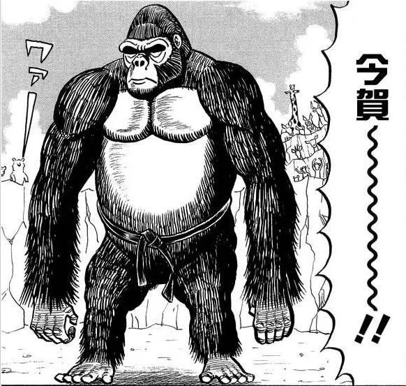 第111话中,今贺遇到了史上最强对手——被称为“King of Kings”的狮子。狮子就像一位武装到牙齿的战士,在身体条件上今贺处于绝对的劣势。不过好在今贺还有柔术这棵救命稻草。在这场打斗中,今贺可谓是倾尽了全力,使出了浑身解数。加上今贺对于柔术师父的回忆桥段,本漫画作者花了近三十话的大篇幅来展现此战,足以见到作者对于这位“猩猩柔术家”的重视程度。