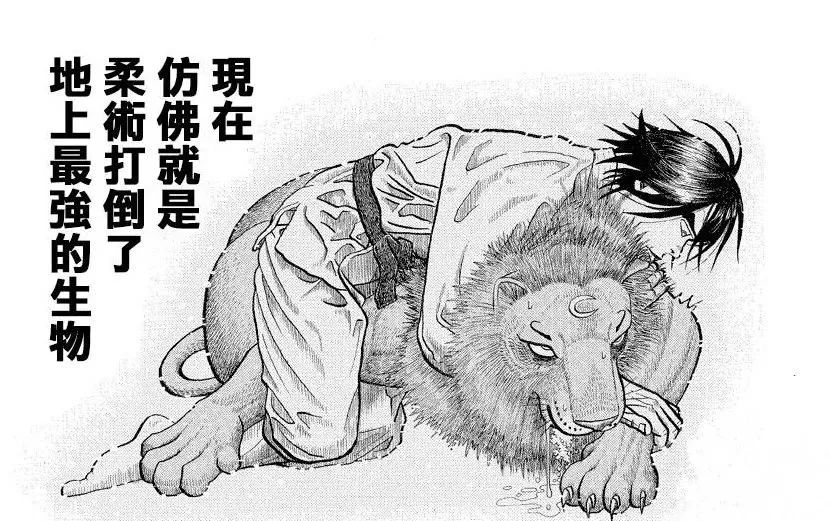 我们挑出其中的一个经典的场景来作出解析。狮子作为猫科动物,身体结构与人类有很大不同,其柔韧性、身体灵活度及关节可旋转程度都使今贺的柔术技术失去作用。