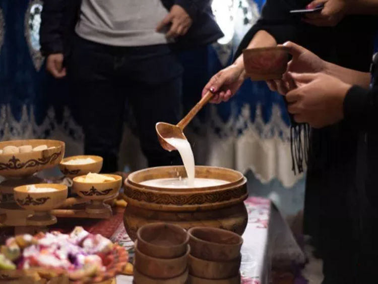 当然,在饮食之后,必须要来一份马奶子,马奶子是柯尔克孜族、哈萨克族最喜欢的饮料。马奶子是将新鲜的马奶装进新疆人特有的牛皮桶中放入发酵用的酵母和酒曲,经过发酵时间的等候,便可以感受马奶子味带咸酸又有轻微的酒香的草原饮品。在新疆牧区草原上,饲养马匹的牧户,都能自制马奶子,供日常饮用和款待宾客,马奶子可以帮助消化,健胃益脾,对于远方来草原的客人而言,是最佳的入睡饮品。
