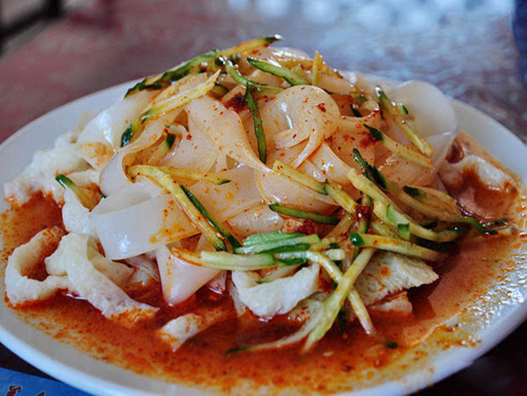 食用肉类必须配上主食,新疆的主食主要是凉皮子和手抓饭。凉皮子就是我们常见的凉皮,新疆凉皮传承了陕西、甘肃地区的凉皮携带着草原和风沙的独特味道。在每个街道上,都会有一家新疆大妈贩卖着凉皮,宽条状的凉皮加上面筋、甜酱、香醋、麻油、味精、辣子面、孜然粉、鲜芫荽末等各种调料,新疆大妈戴上手套将凉皮与各种调味料进行搅和,最后撒上一点新疆辣椒粉,让你在夏日感受新疆人的爽快。