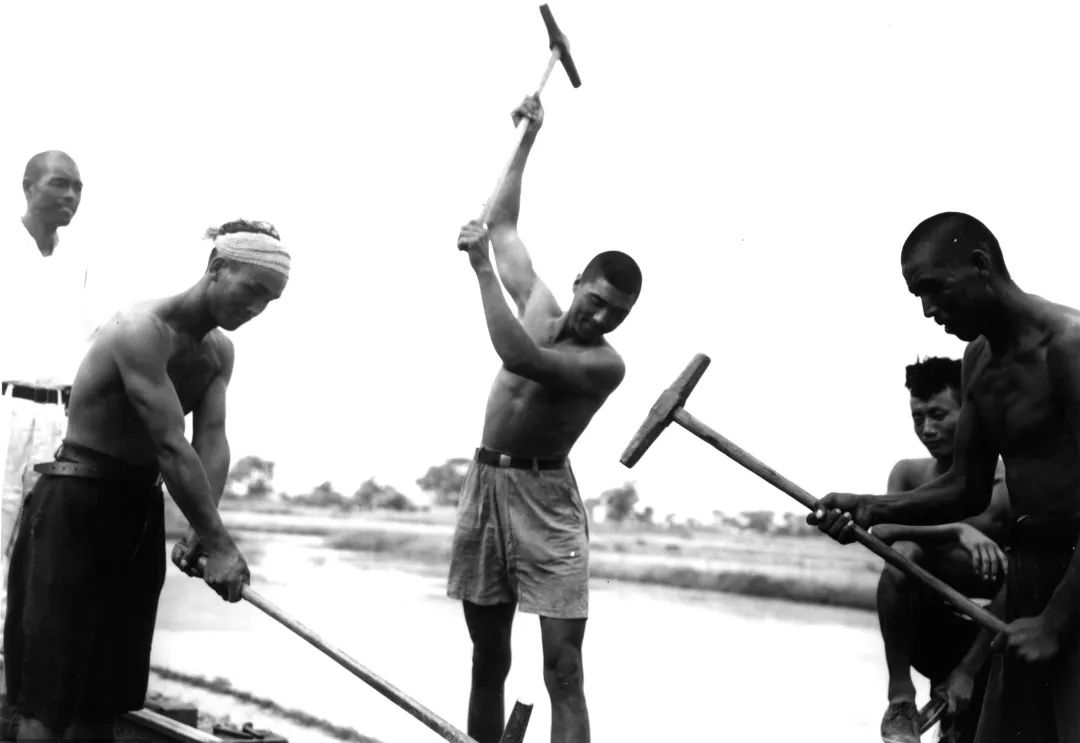 四十年代末,工人们在安装加固铁轨。追求实干,崇尚朴素,人们很容易把光膀子劳动和艰苦奋斗联系起来