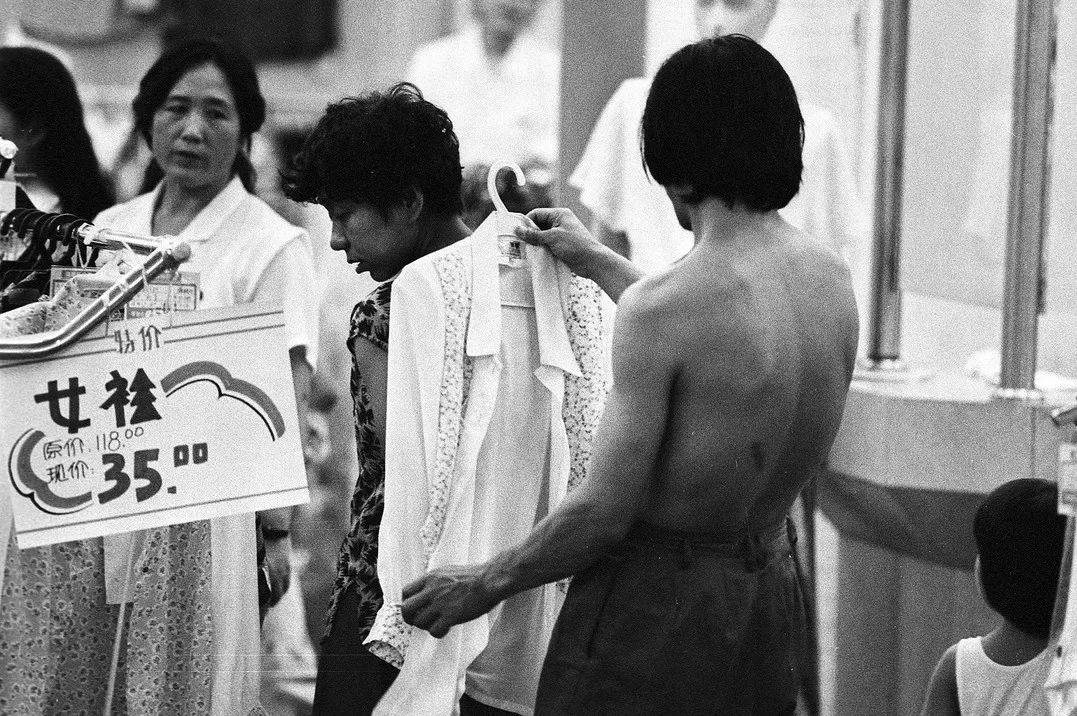 1996年7月,北京菜市口百货商场,男人光着膀子出来散步、购物,大家都习以为常