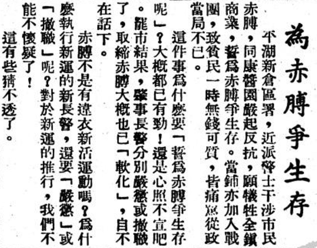 甚至在某些地方还发生过因为取缔赤膊闹出来的罢市。浙江平湖新仓镇警察执行“新生活运动”,干涉市民赤膊,一些商家、当铺“誓为赤膊争生存”,以罢市这种方式来抵抗[21]。