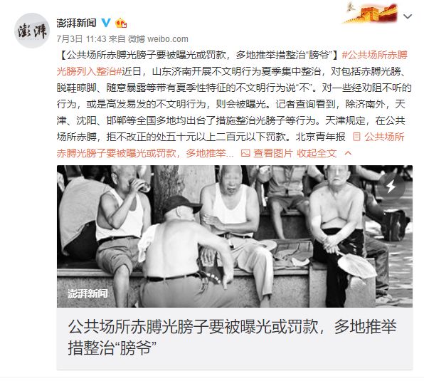 今年,包括济南、天津在内的多地开始将光膀子作为不文明行为进行整治。